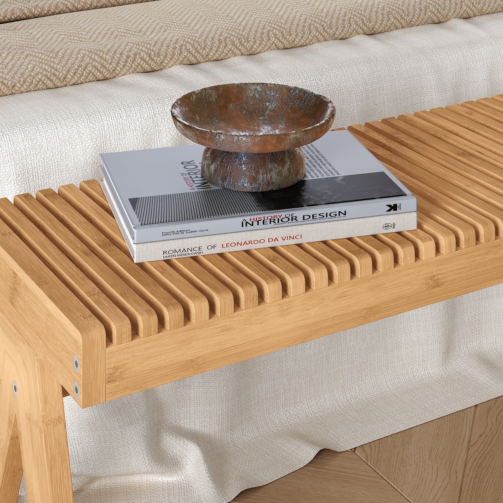 Ud over gangen og entréen kan den alsidige bænk også placeres i soveværelset, for eksempel ved fodenden af sengen, eller i stuen, hvis der er brug for en ekstra siddeplads. Takket være det fugtbestandige bambusmateriale anbefales den også til badeværelset, hvor den kan rumme håndklæder, frisk vasketøj eller bruseredskaber og fungere som en hylde til tøj under bruseren.