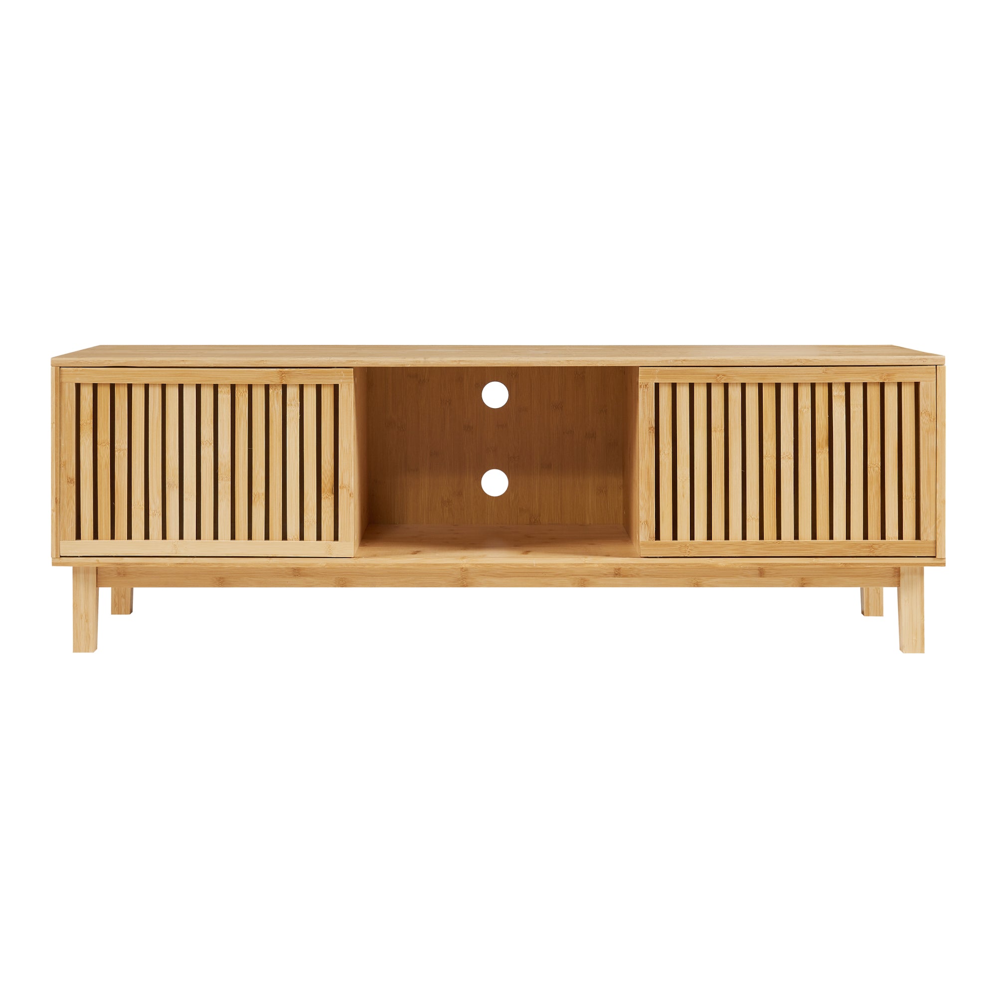 Den rummelige overflade på tv-møblet giver masser af plads til dit tv. Nedenunder er der tre praktiske hylder med to skydedøre, som er ideelle til opbevaring af medieenheder som dvd-afspillere eller spillekonsoller. Det midterste rum har to kabelåbninger, som gør det muligt at føre kablerne pænt igennem. Det bidrager ikke kun til et pænt udseende, men sikrer også, at alle vigtige enheder og tilbehør altid er lige ved hånden.