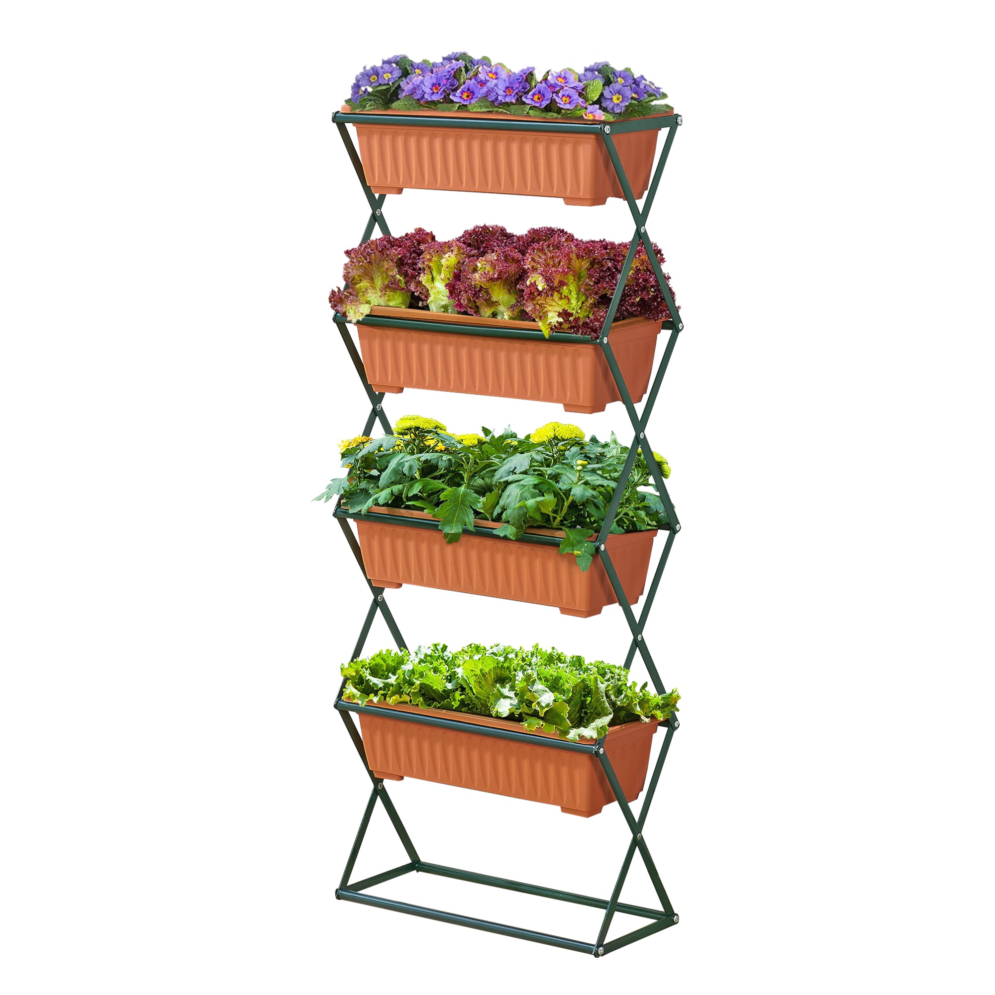 Det pladsbesparende lodrette bed har fire plantekasser og kan hurtigt og nemt foldes sammen. Den lodrette placering af blomsterkasserne gør det muligt at udnytte meget plads på et lille område.